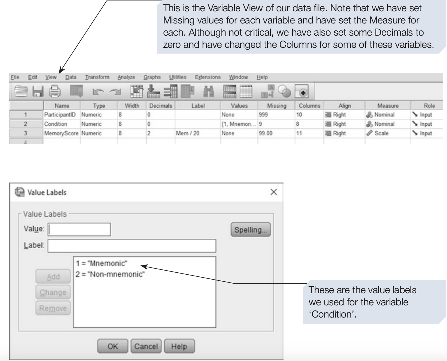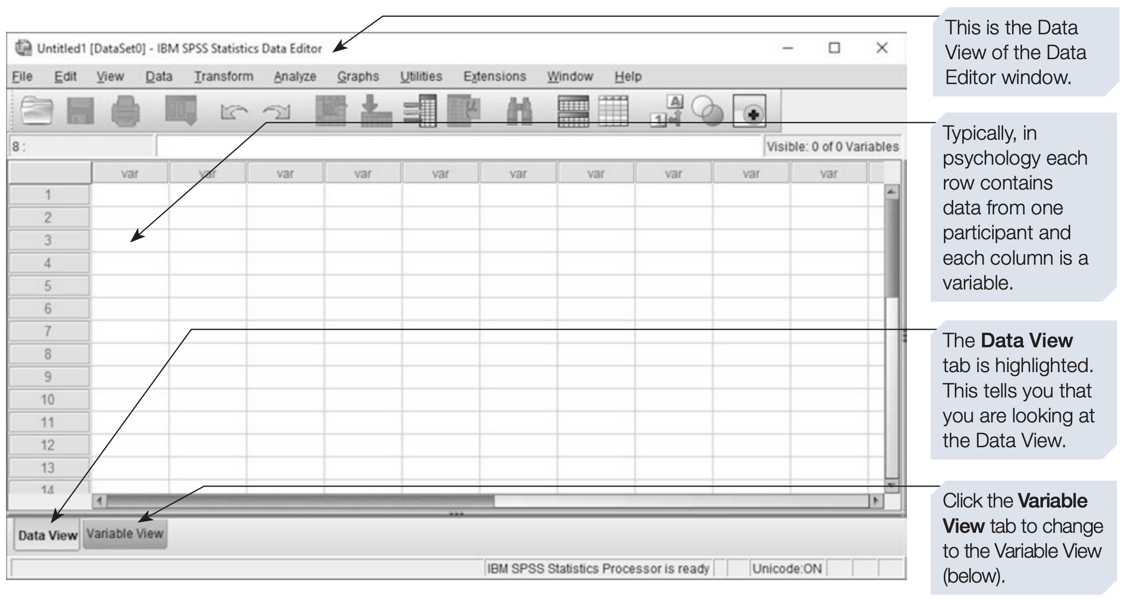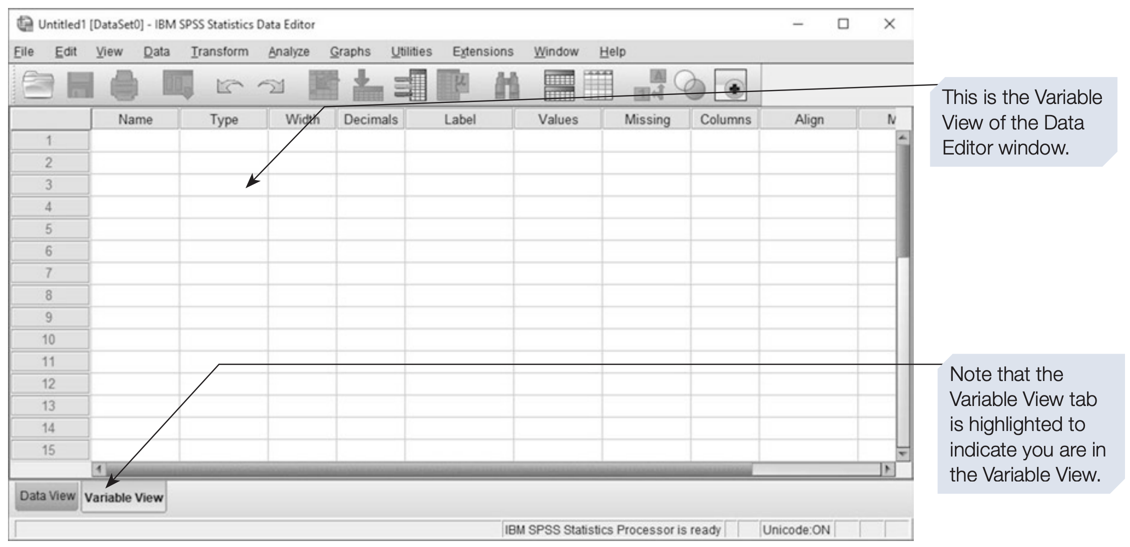 - Variable View – used to define variables, types, labels, and formats.