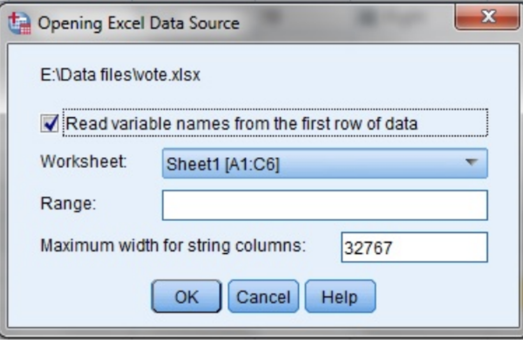 Example: To import only the variables ID and Gender from the first 6 rows, enter A1:B6 in the Range field.