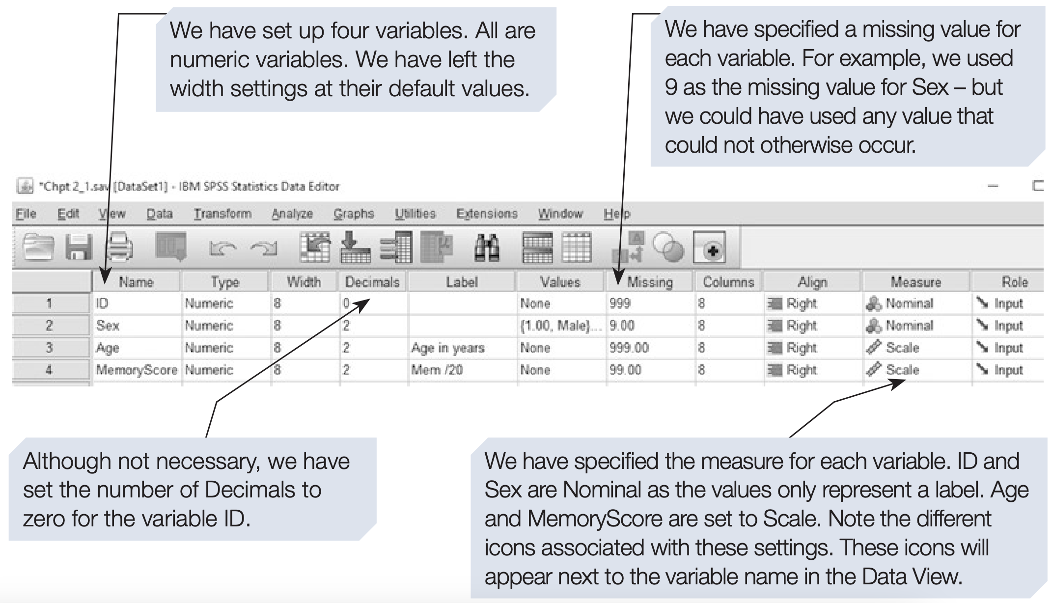 Before we can enter these data, we need to define the four variables to be used (see the previous section for details of how to define a variable)