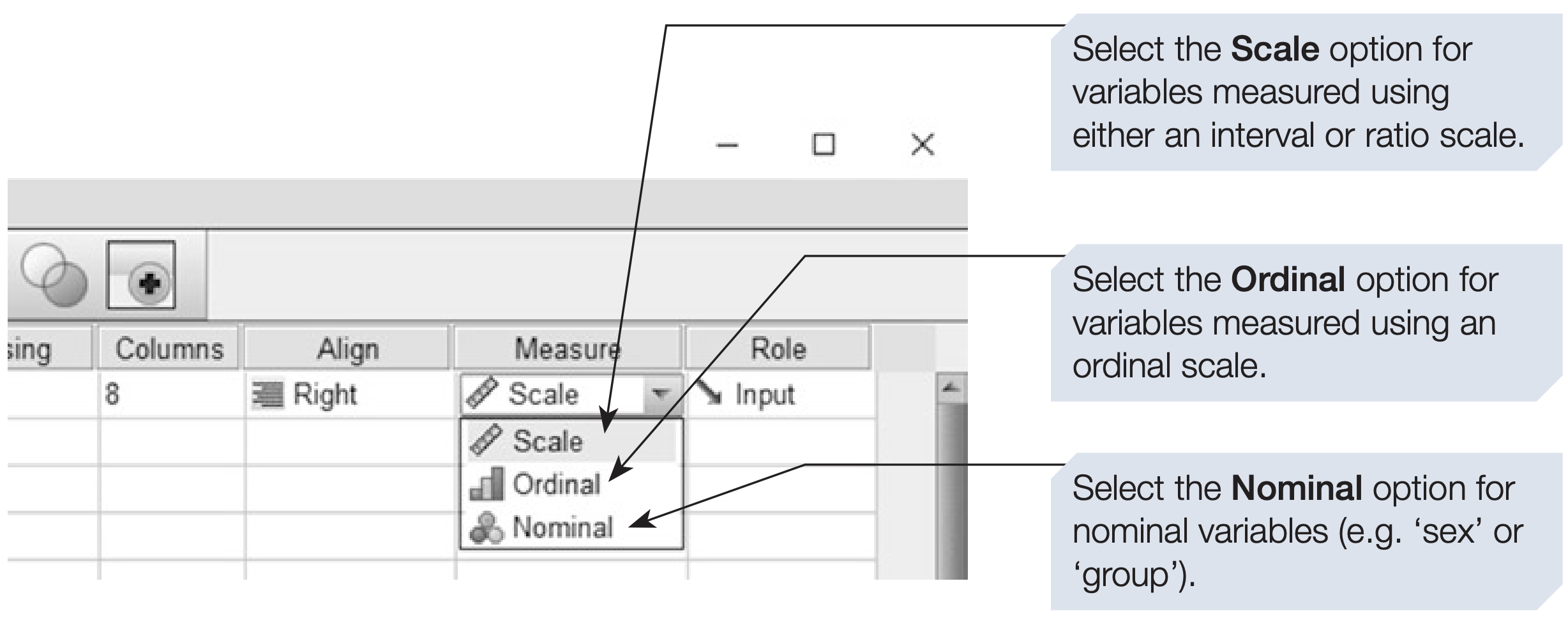 - SPSS offers three options: Nominal, Ordinal and Scale