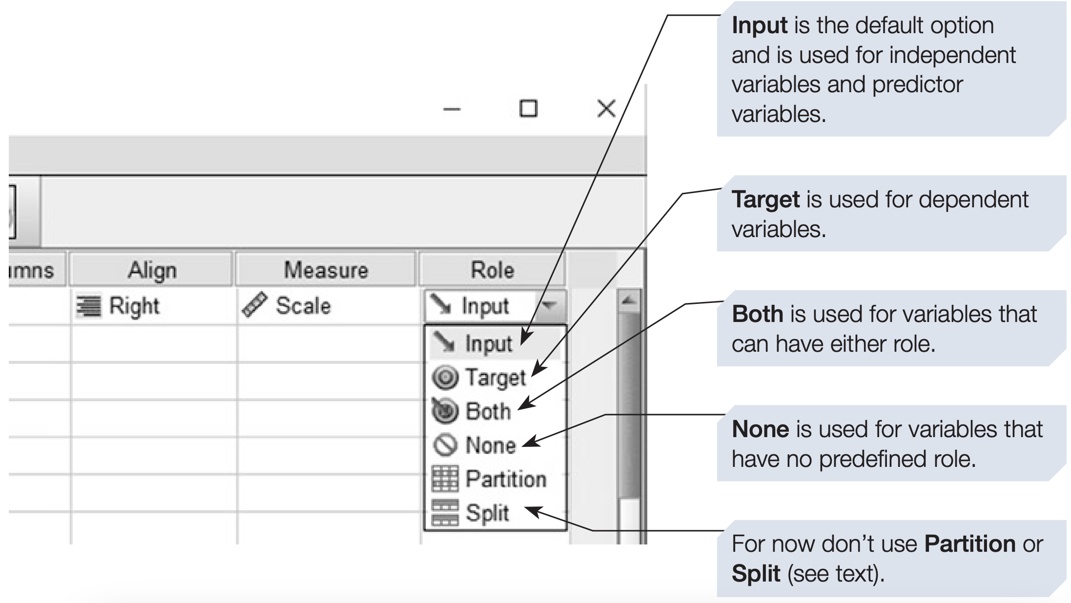 - The final column Role is recent addition to SPSS and is intended to help users select appropriate analyses.