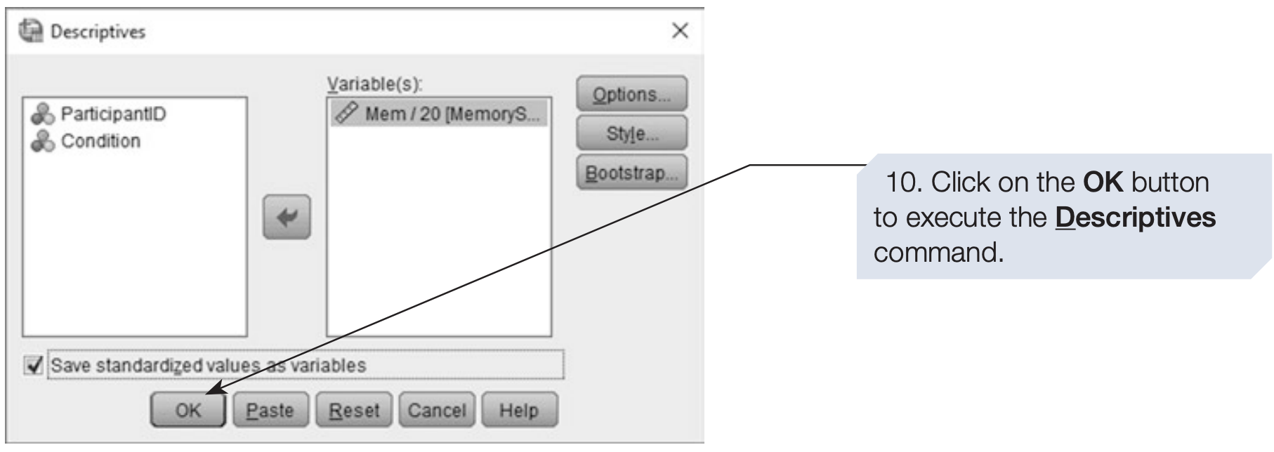 DESCRIPTIVES VARIABLES=MemoryScore