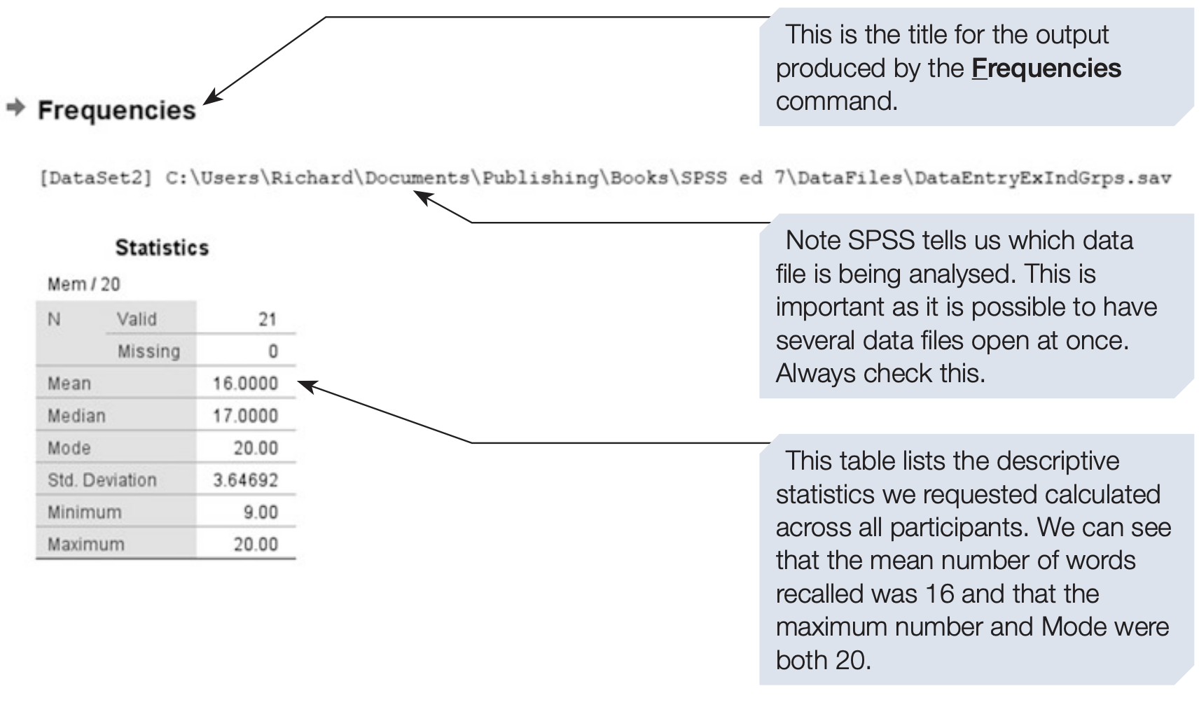 The output from the Frequencies command typically includes: