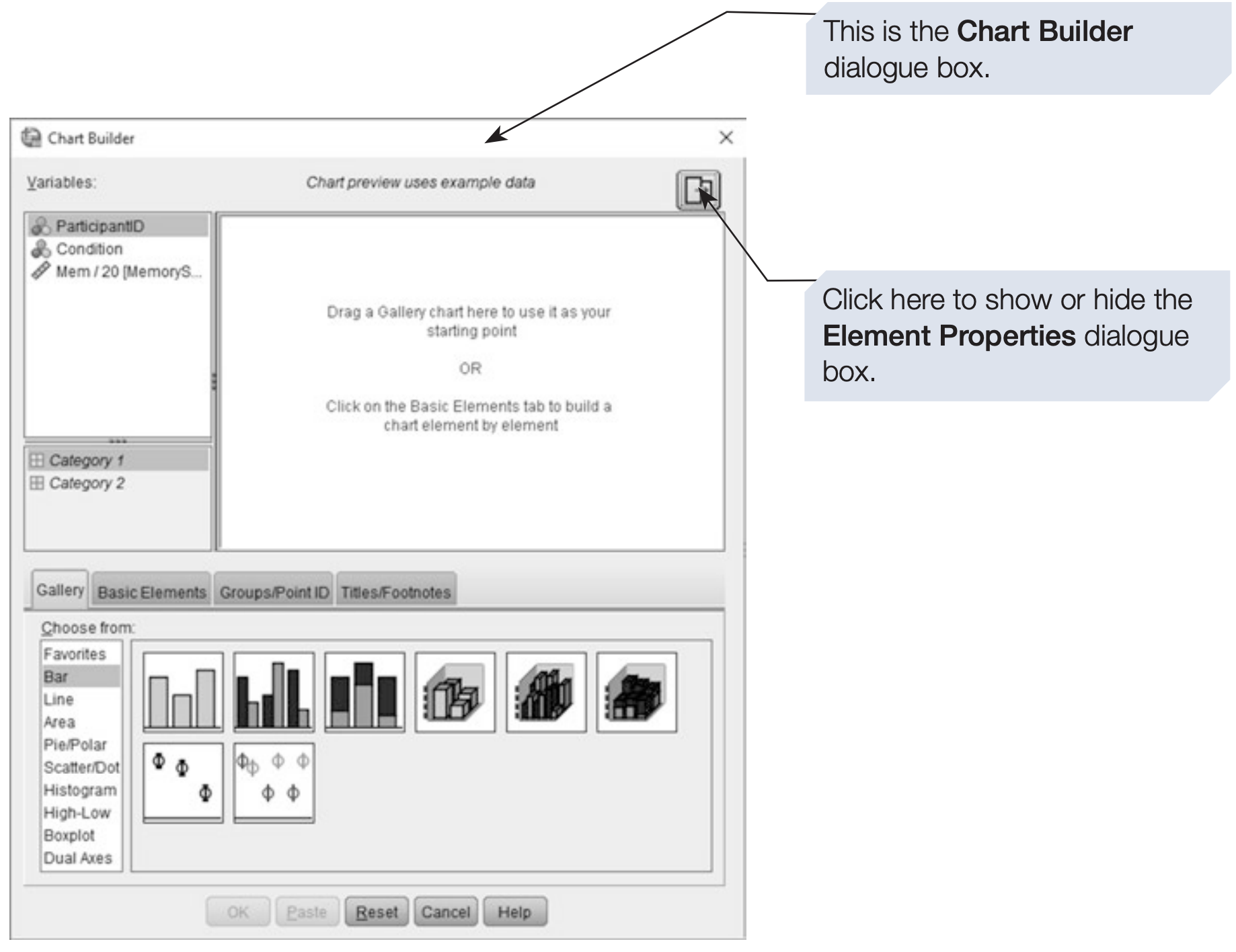 SPSS will open two linked dialog boxes: 1. Chart Builder 2. Element Properties