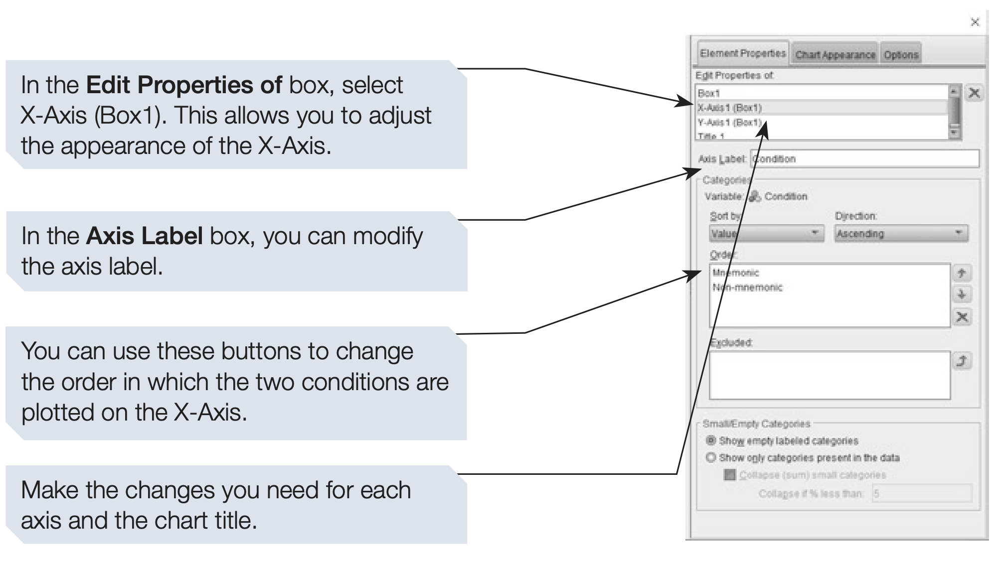 In the Element Properties dialog box (accessible via the button at the top right of the Chart Builder), you can adjust the appearance and statistical elements of your chart — for example, changing labels, scales, or the measure of central tendency.