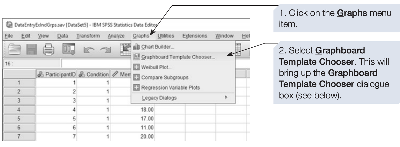 In this section, we will use the dataset from the Independent Groups Study of Memory, created in Chapter 2. (download memory.sav)