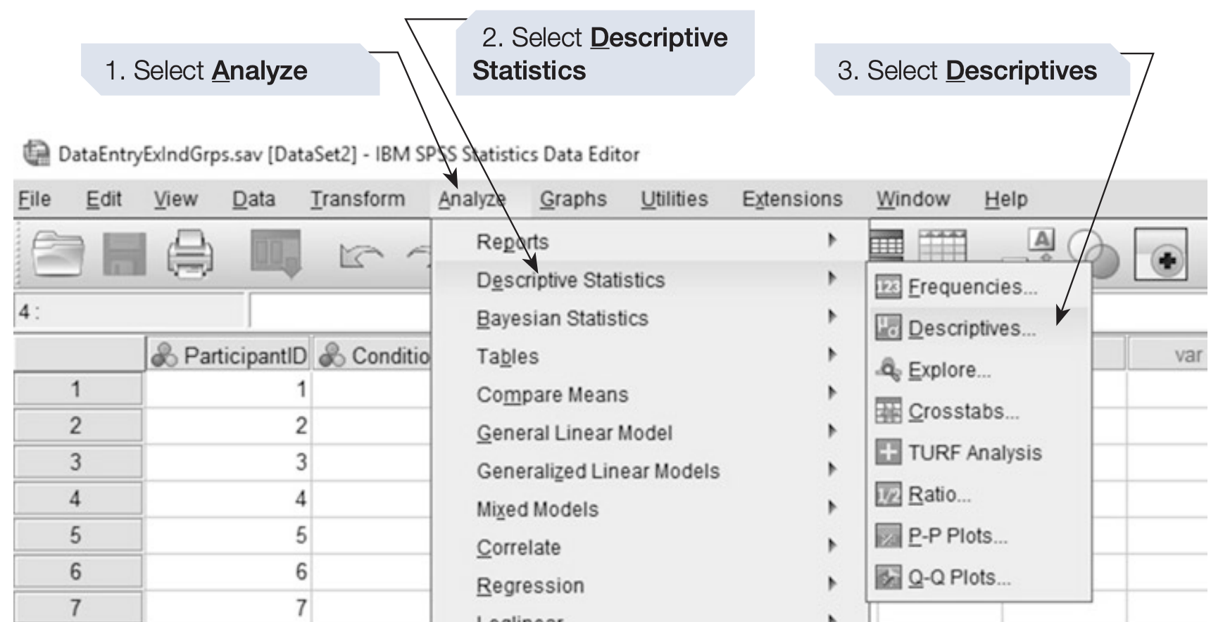 • Among these, the most frequently used are Descriptives and Frequencies, both found under the Descriptive Statistics menu.