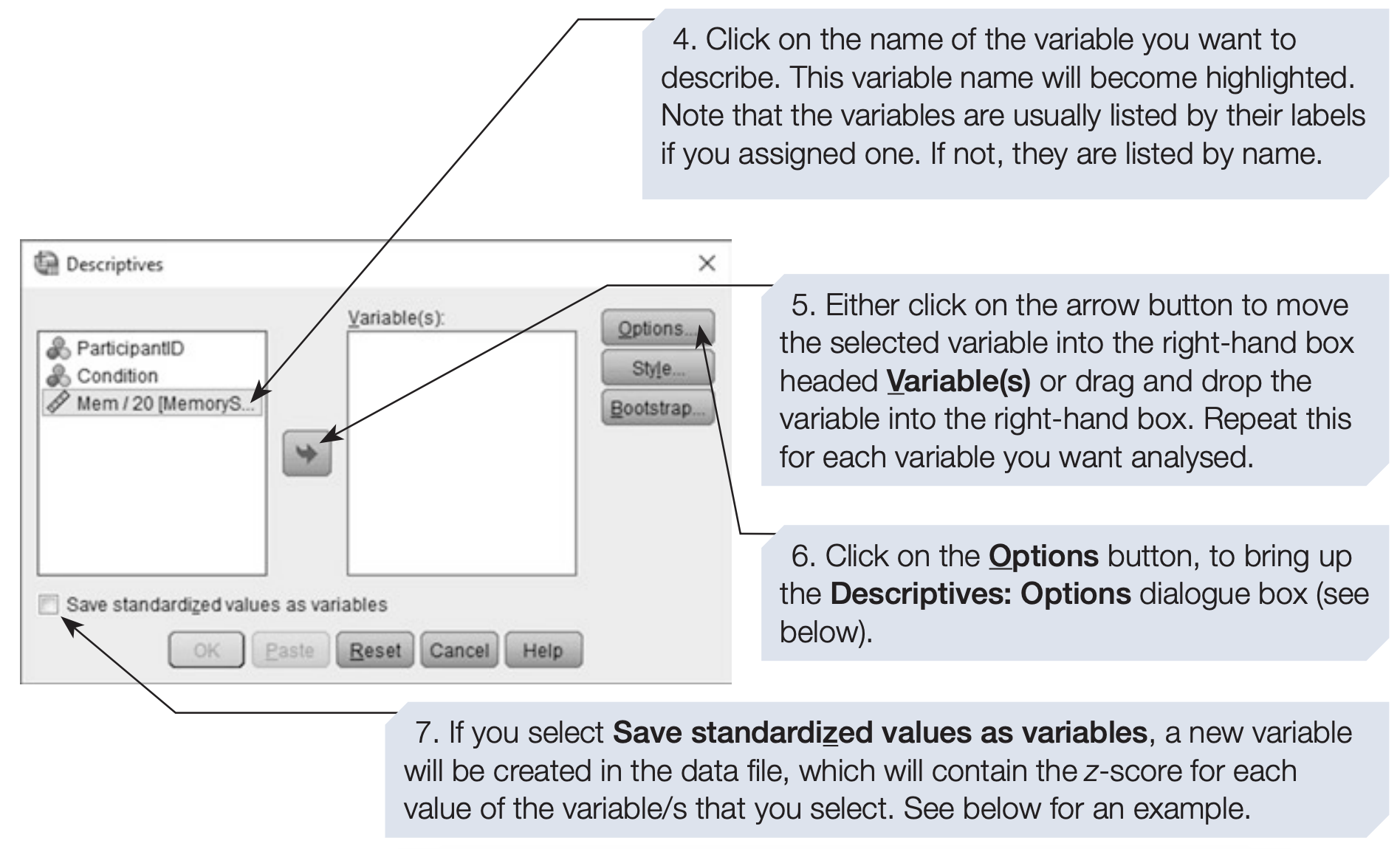 • Most inferential commands in SPSS can also produce relevant descriptive statistics.