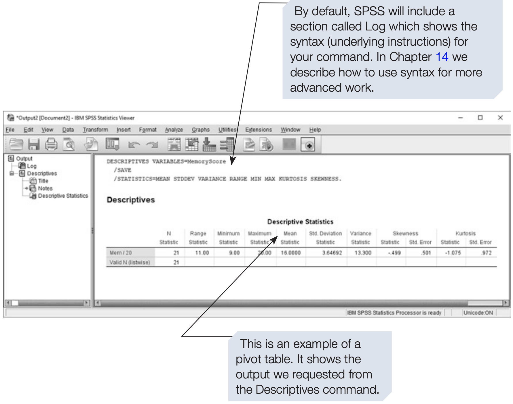 • After running a command, SPSS displays results in a new window called the Viewer.