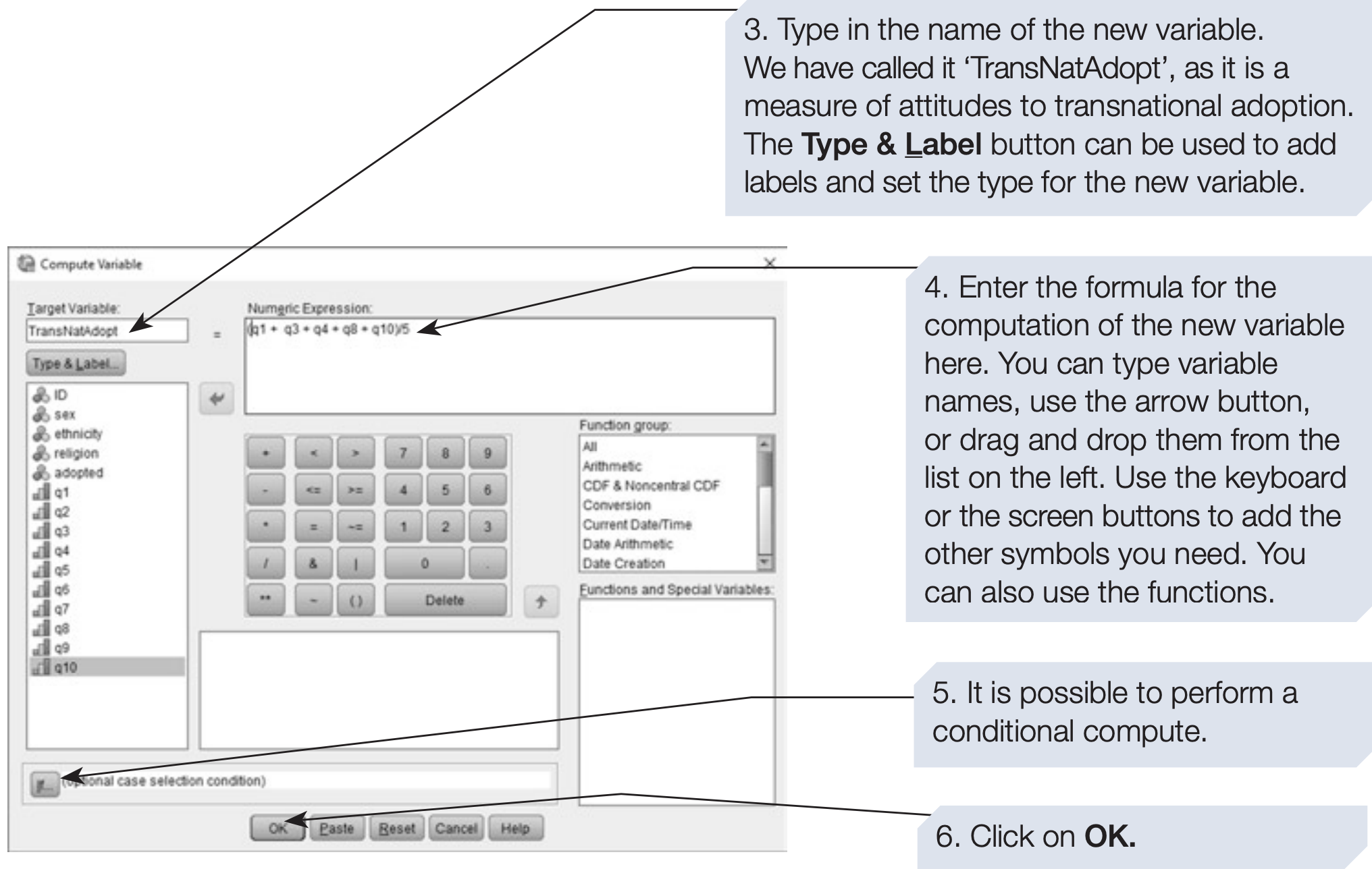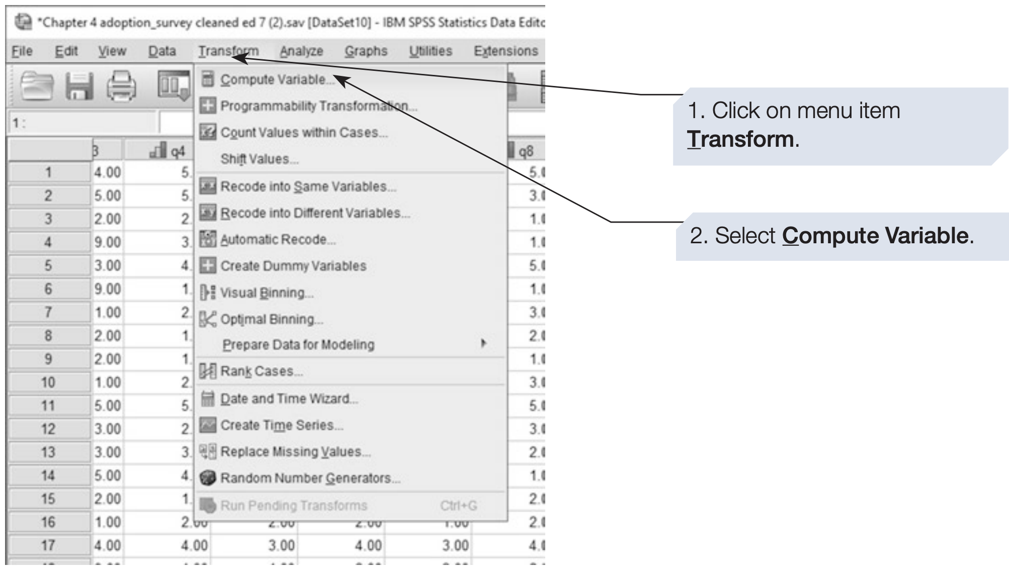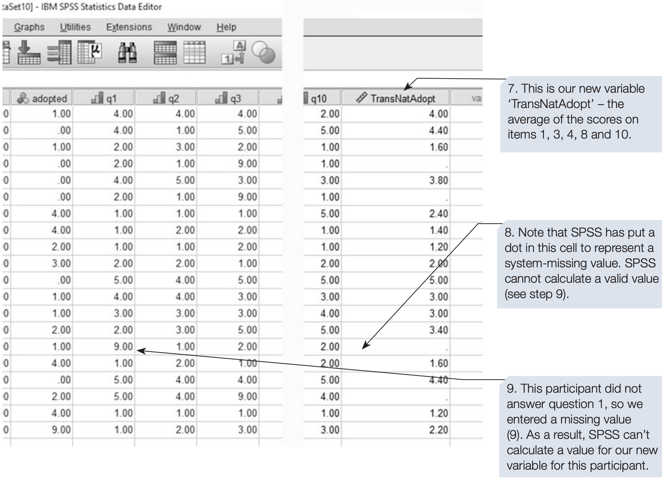 COMPUTE adopt_sub1 = SUM(q1 TO q5). COMPUTE adopt_sub2 = SUM(q6 TO q10). COMPUTE adopt_total_mean = MEAN(q1 TO q10). EXECUTE.