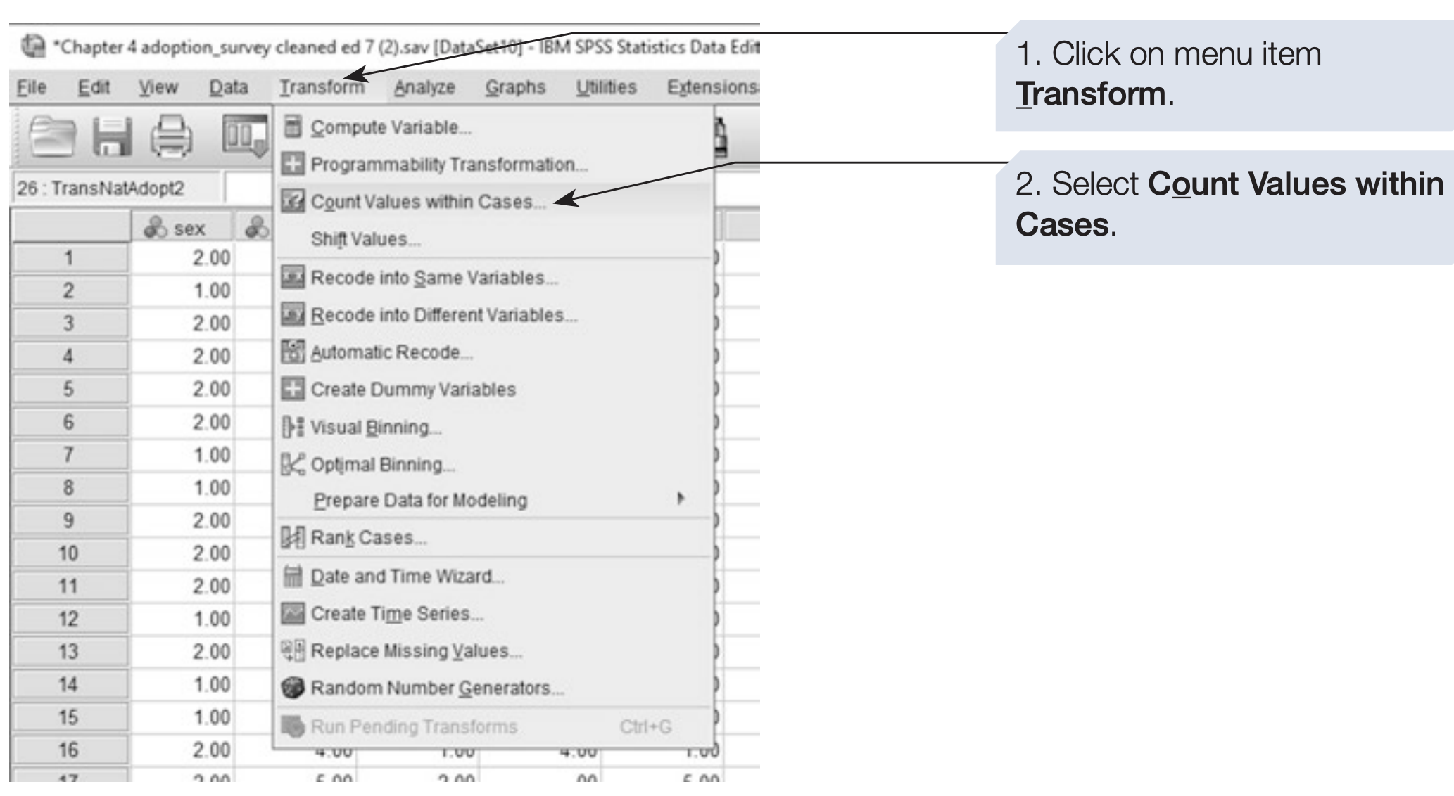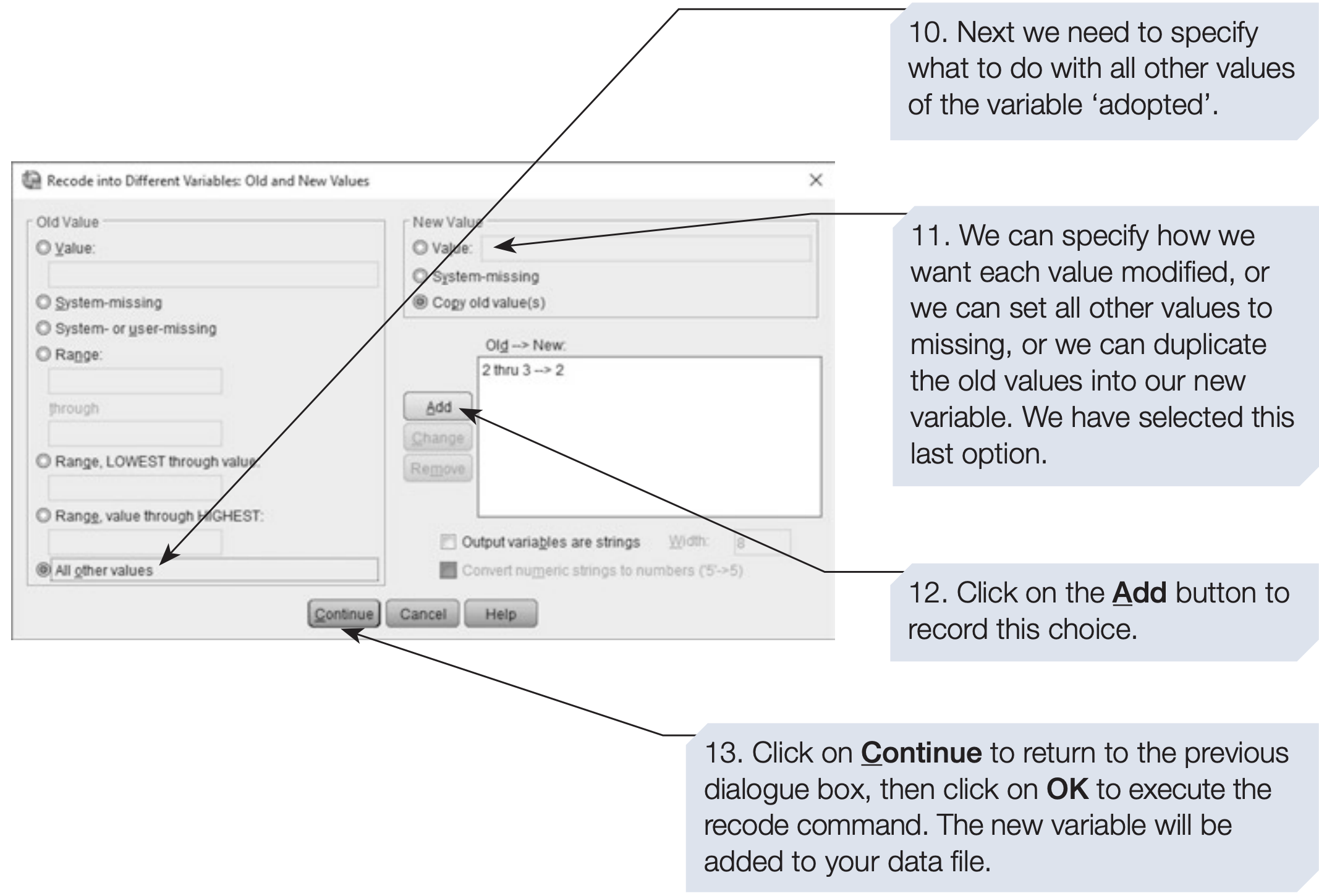 RECODE adopted (2,3 = 2) INTO NewAdopt. EXECUTE.Conditional recoding (example: reverse-score for females only)