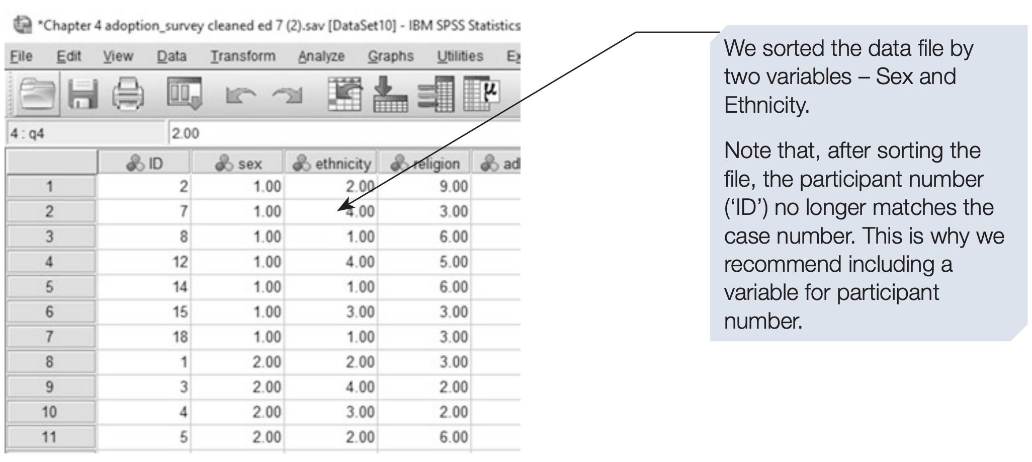 Although the order of cases usually does not affect statistical analysis, sorting can make it easier to inspect and verify data. For example, sorting participants by sex and then by ethnicity can help detect data entry issues or compare group distributions.