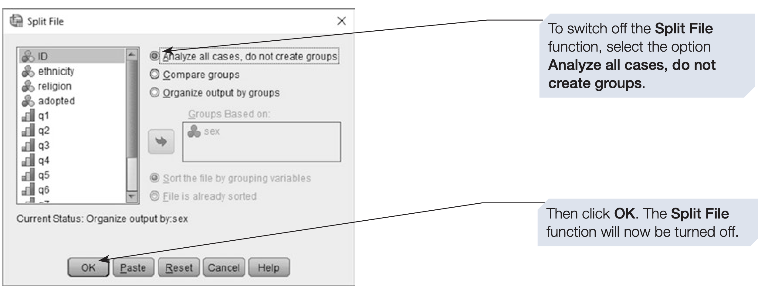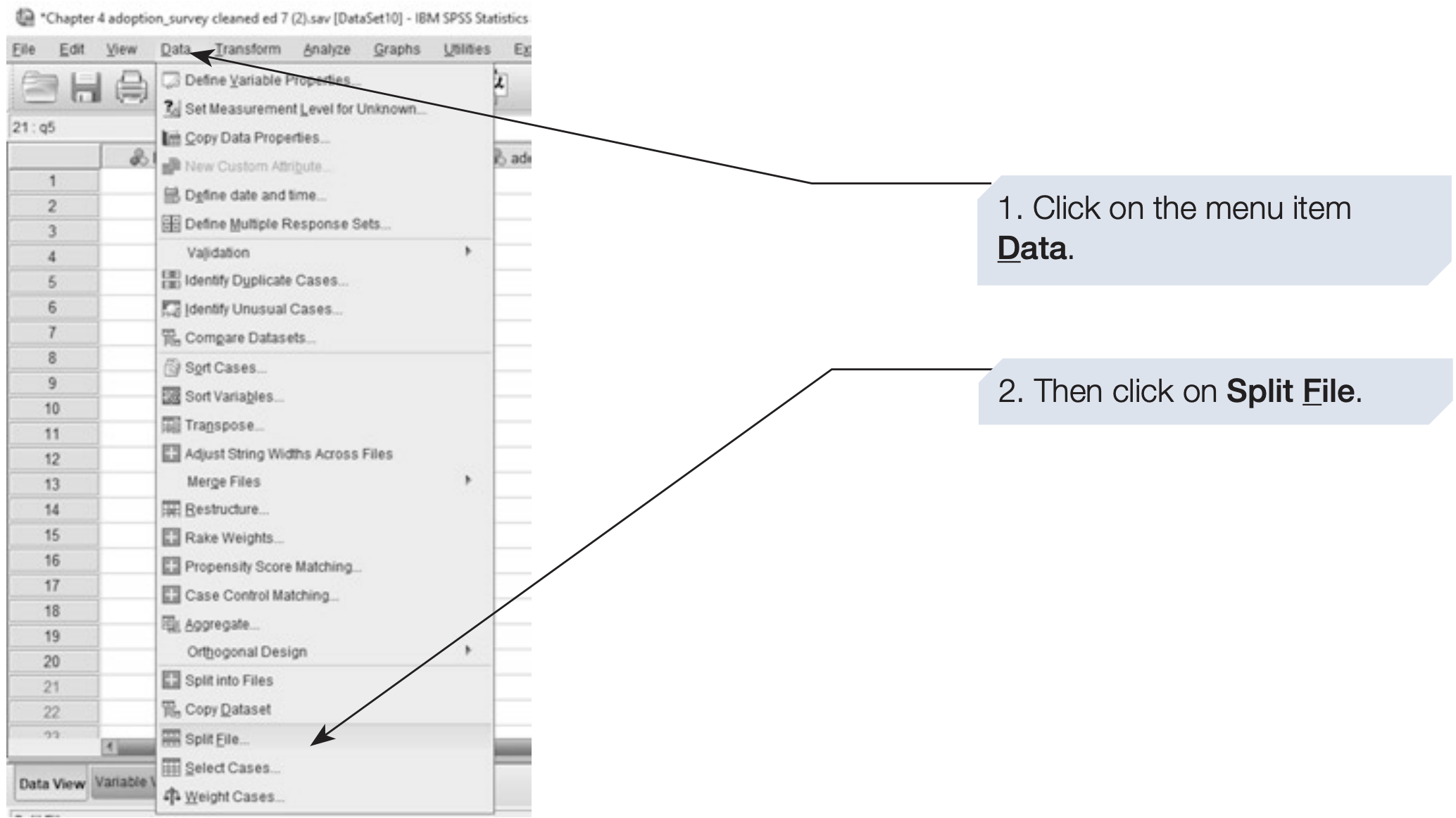 The Split File function allows SPSS to temporarily divide a dataset into groups, so that all subsequent analyses are performed separately for each group.