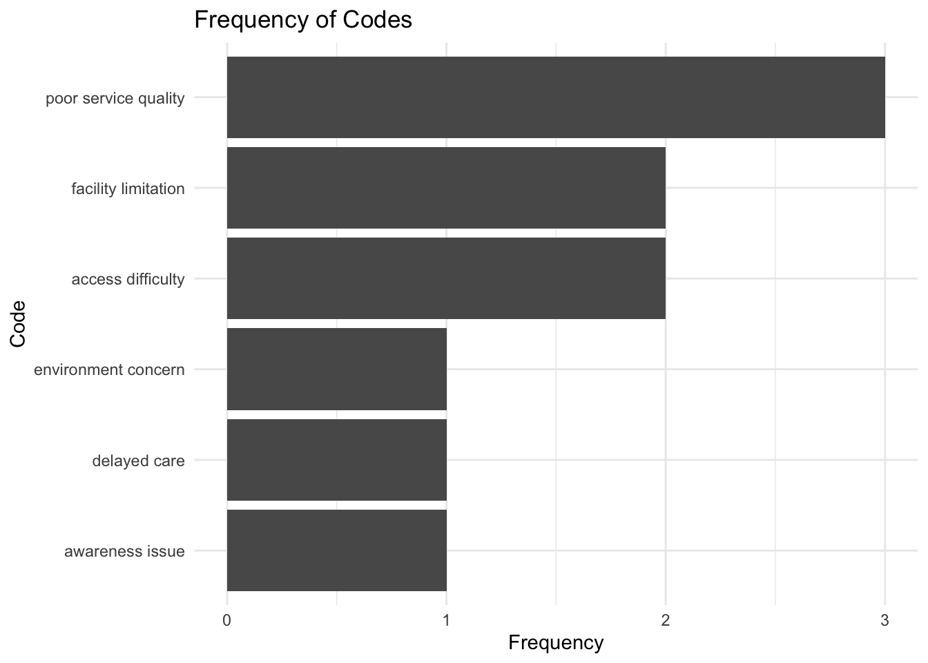 Several codes relate to treatment limitations and system inefficiency. These begin to cluster into broader concepts.